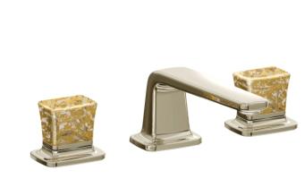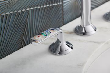 另一款Per Se Decorative龍頭設計,採用玲瓏剔透的水晶,內裏配以珍貴華麗的金箔,含蓄地展現奢華格調,於燈光照射下更顯閃爍光芒,為浴室增添堂皇大氣的感覺,流露優雅華貴的氣息。精緻的水晶金箔把手配合前衛簡潔的流線型龍頭設計,更突顯把手的高貴質感,讓簡約與華麗同時交織出現代美學的優雅嫵媚。
